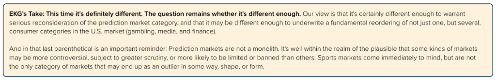 EKG added that the best-case scenarios for prediction markets’ volume expansion depended greatly on sports event contracts doing much of the work.