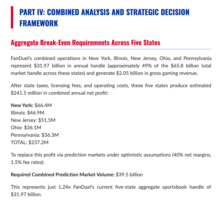Let’s pull out that figure: The required combined prediction market volume necessary to achieve in the select states to replace the existing revenue, according to Robinson’s calculations, is $39.5 billion, which “represents just 1.24x FanDuel’s current five-state aggregate sportsbook handle of $31.97 billion.”