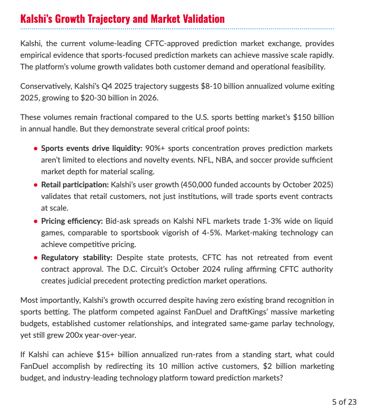 “The emergence of sports prediction markets creates massive risk for FanDuel: if they stand down on entering sports prediction markets, they risk missing what may be the biggest shift in the industry since the repeal of PASPA,” writes Chicago-based researcher and semi-professional sports bettor Adam Robinson, a board member of sports betting advocacy group American Bettors’ Voice. “On the other hand, entering these markets could jeopardize their state-regulated business model.”