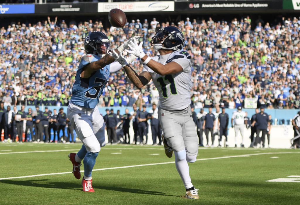 Seattle Seahawks wide receiver Jaxon Smith-Njigba makes a touchdown catch against Tennessee Titans safety Amani Hooker. Credit: Steve Roberts-Imagn Images