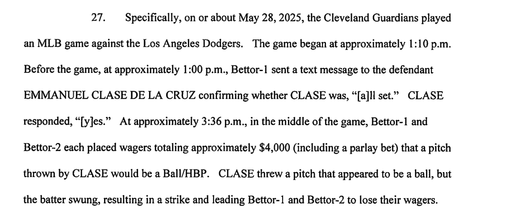 The first occurrence detailed was on May 19, 2023 vs. the New York Mets. Clase allegedly shared information with the bettors, promising a pitch faster than 94.95 mph. The bets paid approximately $27,000. It appears from court documents that Clase was betting through the 2023 and 2024 seasons, but in April 2025 “requested and received bribe and kickback payments.” In June, Ortiz began participating in the scheme.