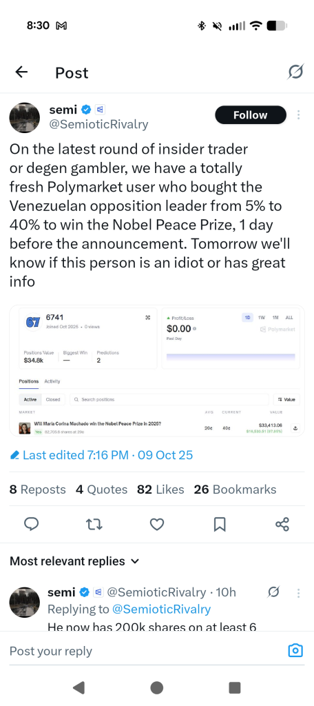 Some persons somewhere Thursday night had a thunderbolt of a notion that Venezeulan opposition leader María Corina Machado was going to win the Nobel Peace Prize. Or maybe they had some insider info.