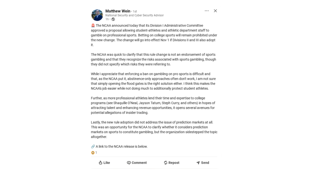 “The Administrative Committee was clear in its discussion today that it remains concerned about the risks associated with all forms of sports gambling but ultimately voted to reduce restrictions on student-athletes in this area to better align with their campus peers,” Josh Whitman, athletics director at the University of Illinois and chair of the committee, said in a release. “This change allows the NCAA, the conferences, and the member schools to focus on protecting the integrity of college games while, at the same time, encouraging healthy habits for student-athletes who choose to engage in betting activities on professional sports.”