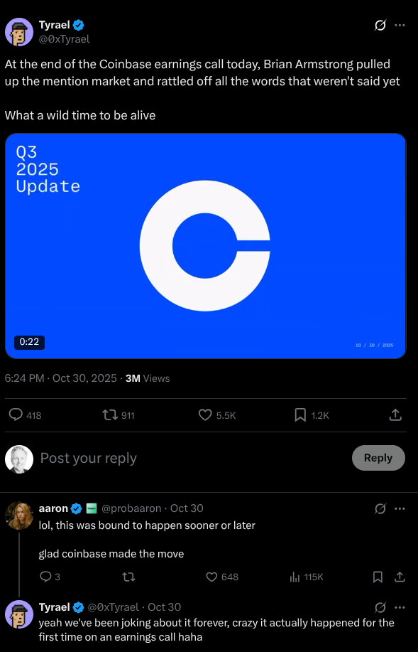 Coinbase CEO Brian Armstrong said at the Dealbook Summit on Wednesday that he was just having some fun when he concluded a Q3 earnings call in late October by intentionally prattling off several words that were being used in mention markets on Kalshi and Polymarket.