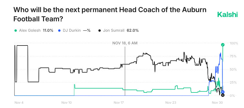 Not the Securities Exchange Commission. The Southeastern Conference. The “truth engine” wasn’t sure that Alex Golesh would be the next Auburn head coach until about five seconds before it happened. The site was all over DJ Durkin and Jon Sumrall before Golesh was announced on Nov. 30.