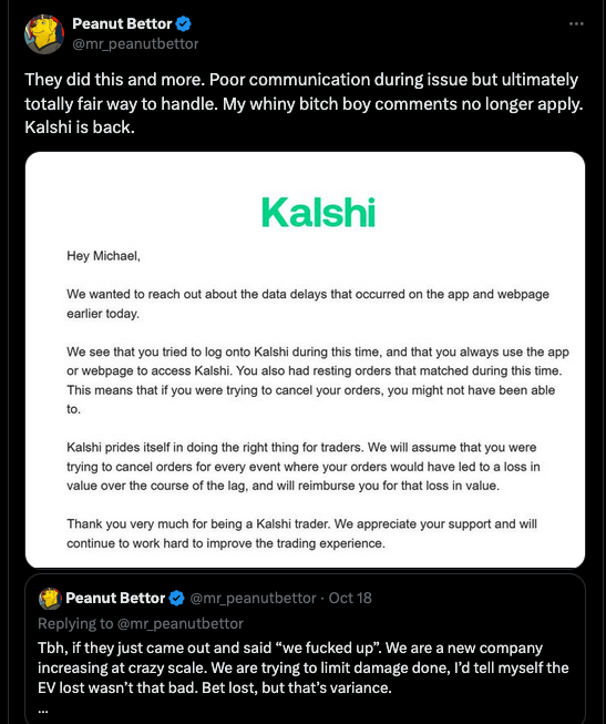 Kalshi sent an email to users who exclusively used the website or app to trade and who had active trade offers that were accepted, letting them know that they would be refunded for losses resulting from the outage. This move generally was received positively.
