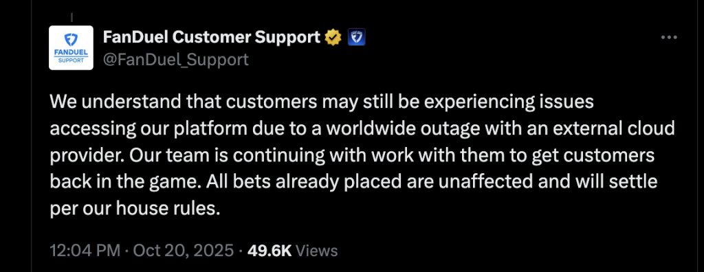 On Monday, major sportsbooks FanDuel and Fanatics suffered outages of their own, apparently related to an issue with cloud computing provider Amazon Web Services (AWS), which hosts servers for many of the world’s most-used websites.