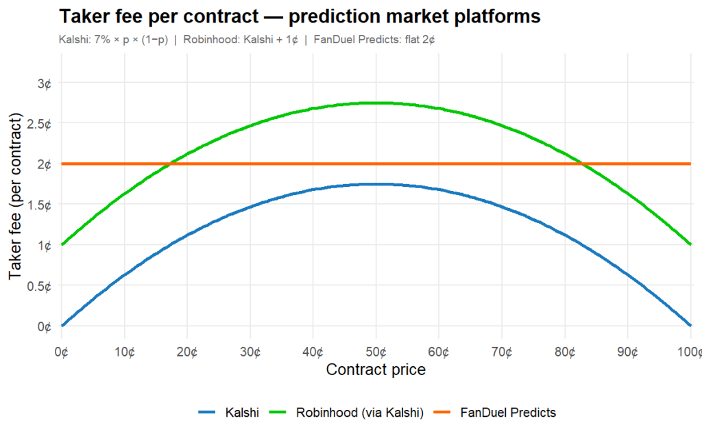 One issue that may be affecting volume, likely heightened during the first two rounds of The Masters, is that FanDuel Predicts’ fee formula discourages bets on longshots or big favorites. The prediction market charges a flat 2 cents on every contract, shared evenly between itself and CME. DraftKings Predictions has the same formula.