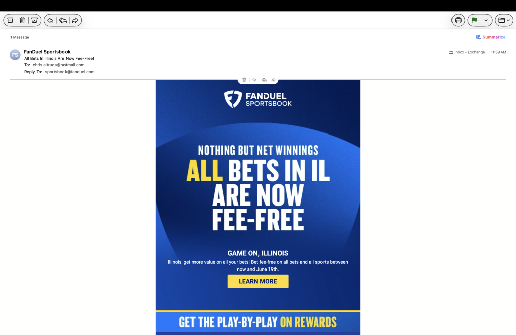 An email sent to Illinois bettors did not explain why FanDuel is waiving the surcharge, simply that the digital titan is opting to do away with its pass-through. None of the other nine mobile sportsbooks in Illinois have yet offered bettors anything similar.