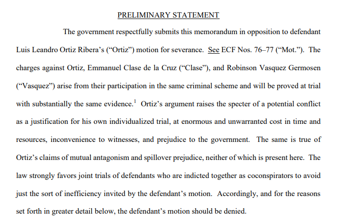 Federal attorneys said the trials should remain together because their guilt “will be proved at trial with substantially the same evidence,” adding “Ortiz’s argument raises the specter of a potential conflict as a justification for his own individualized trial, at enormous and unwarranted cost in time and resources, inconvenience to witnesses, and prejudice to the government.”