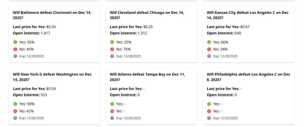 Volume and liquidity on the contracts are low, with some games — such as the upcoming Thursday Night Football matchup between the Atlanta Falcons and Tampa Bay Buccaneers — showing zero trade offers on either side.