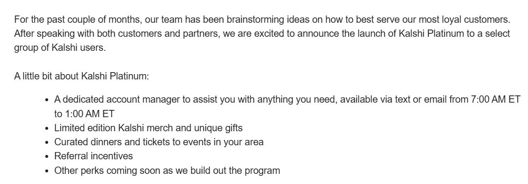 Highlights of the program, per the letter, include a dedicated account manager, limited edition Kalshi merchandise, curated dinners and tickets to local events, and referral incentives.