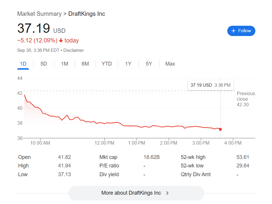 DraftKings shares closed at $37.40, down 11.6% for the day.