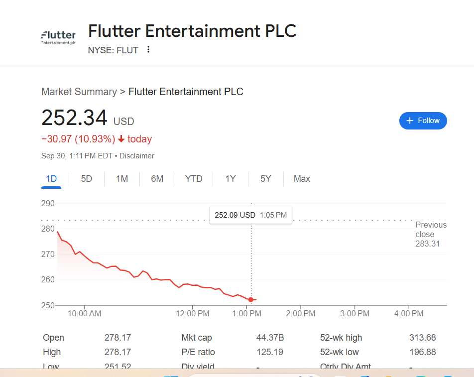 Flutter shares closed at $254.00, a 10.3% one-day decline.