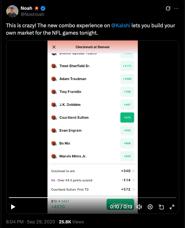 The prediction market rolled out a “build your own” parlay product on Monday afternoon, just ahead of the dual Monday Night Football matchups between the Dolphins and Jets and the Bengals and Broncos. The product launch comes four weeks after Kalshi first self-certified to offer multi-leg bets. The prediction market launched some pre-built parlays before the NFL season opener, but rollout of those bets had been limited since then.