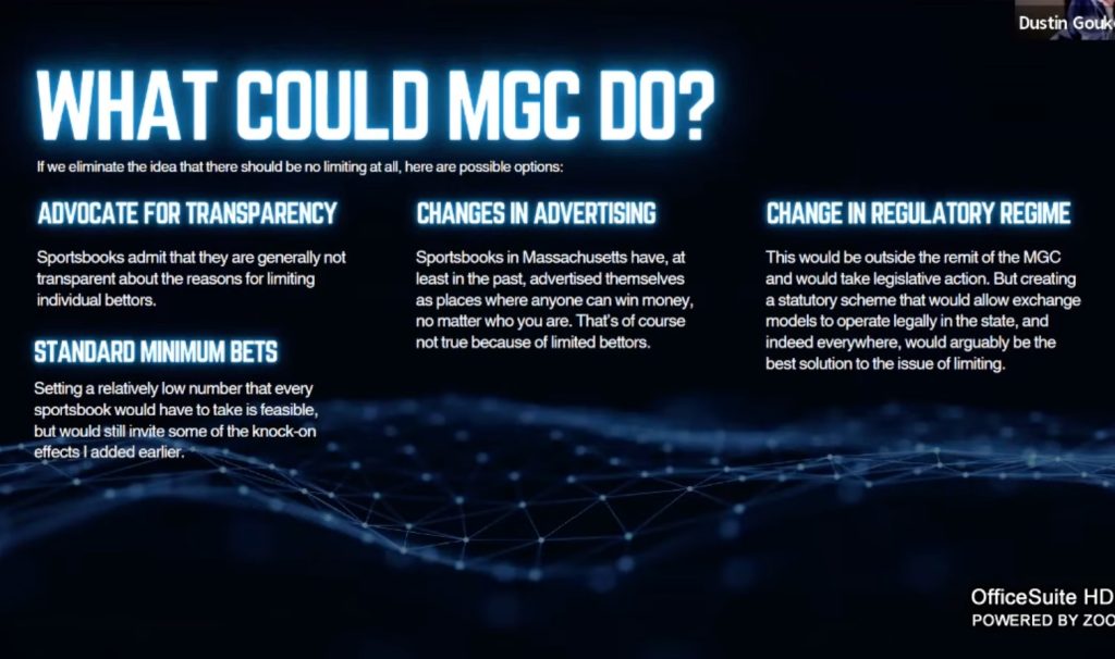 As part of the meeting, The Closing Line author and consultant Dustin Gouker (an occasional contributor to InGame) offered a presentation during which he was clear in saying that operators would push back on the limiting regulations, and suggested that the MGC instead consider opening the market to exchanges, prediction markets, and sharp sportsbooks.