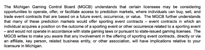 The Michigan Gaming Control Board (MGCB) on Friday warned a broad collection of companies doing business in the gambling industry there to not be a part of the proliferation of sports events contracts on prediction markets.
