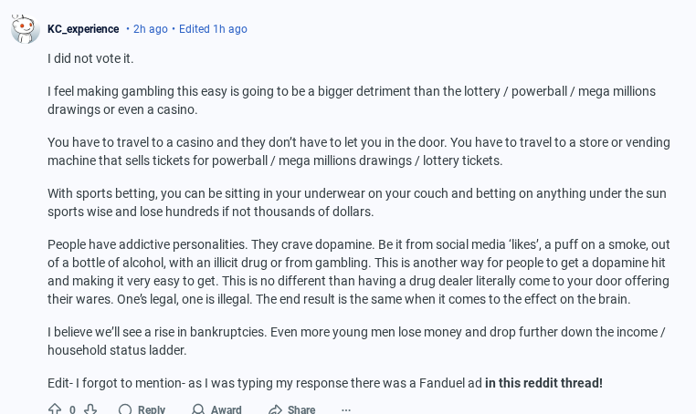 As with most gambling expansion, the topic of sports betting legalization has elicited a combination of excitement, derision, and ambivalence from residents. Some lamented the possible social ramifications and the impact on the state lottery.