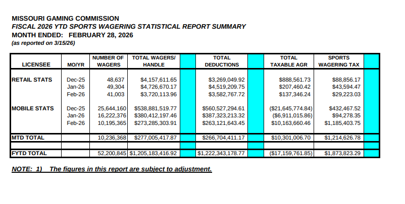 The Missouri Gaming Commission (MGC) on Tuesday reported $30.4 million in gross sports betting revenue for February, with FanDuel and DraftKings again pacing the 16 licensed mobile and retail platforms.