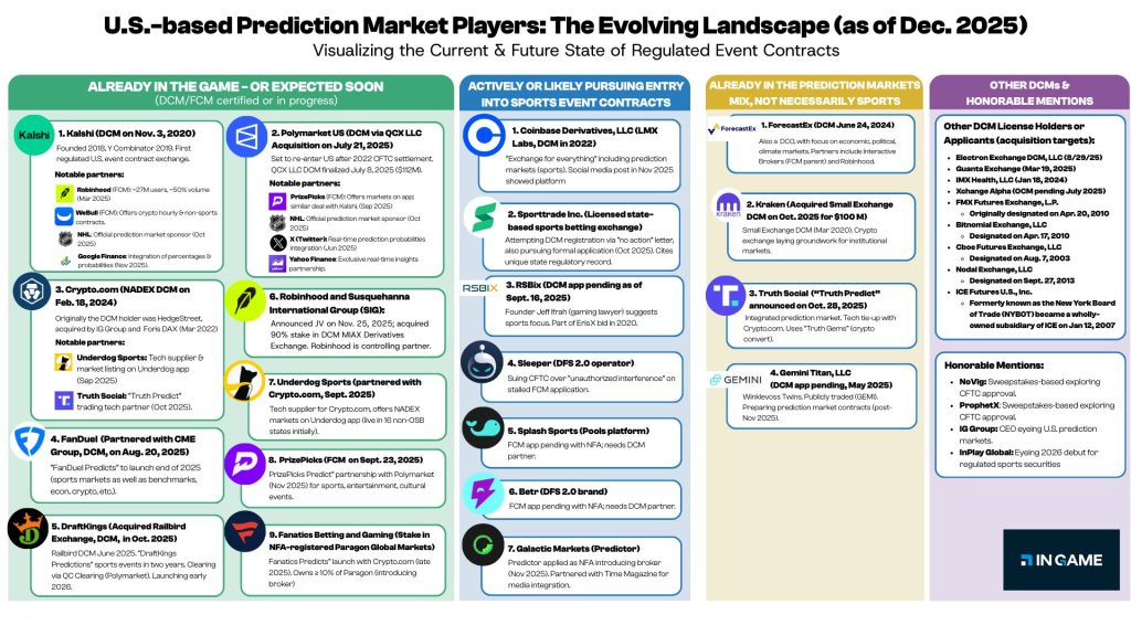 The roster of companies already in the prediction market space is now fairly long, and collectively formidable as competition. Still there are several companies with applications pending before the CFTC, including ProphetX and RSBix, and perhaps other companies quietly circling while the freight train barrels down the tracks heading toward 2026.
