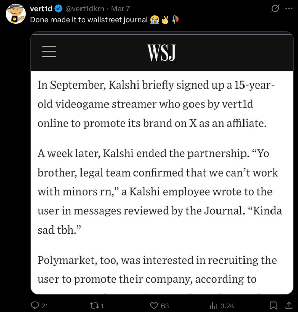 Kalshi briefly utilized an influencer who was found to have been 15 years old.