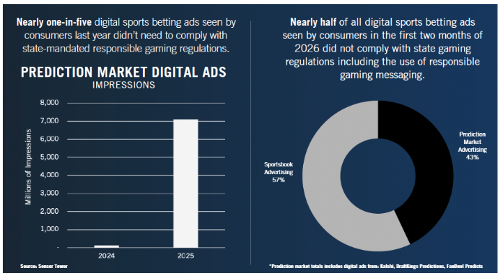 A 2026 Sensor Tower report commissioned by the American Gaming Association trade group found that Kalshi has become the most visible sports betting brand by digital ad impressions, with 5.2 billion in 2025. FanDuel was the next closest with 2.9 billion in the same period. Most of the Kalshi ads lacked responsible gambling messaging.