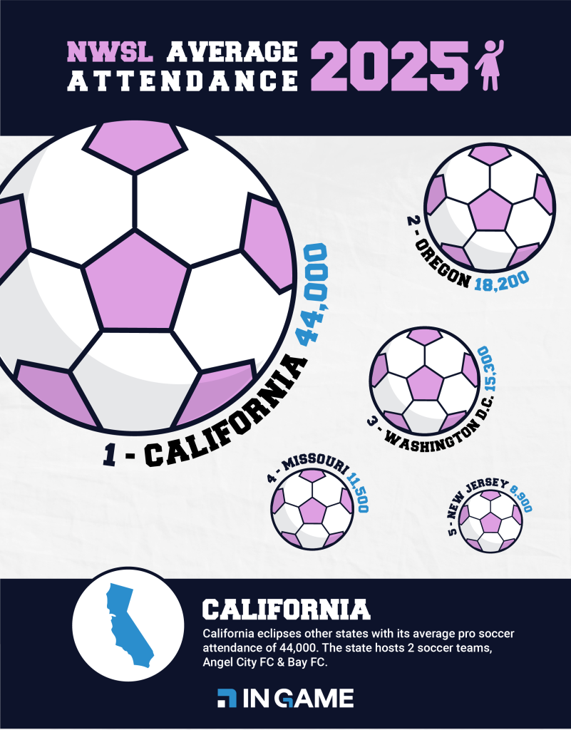 California once again leads the way, recording the highest average attendance in women’s soccer, with a remarkable combined average of 44,000 fans per game week across Angel City FC and San Diego Wave fixtures. Oregon follows as the second-strongest soccer market, with an impressive 18,200 fans attending matches on average, underlining the state’s deep-rooted support.