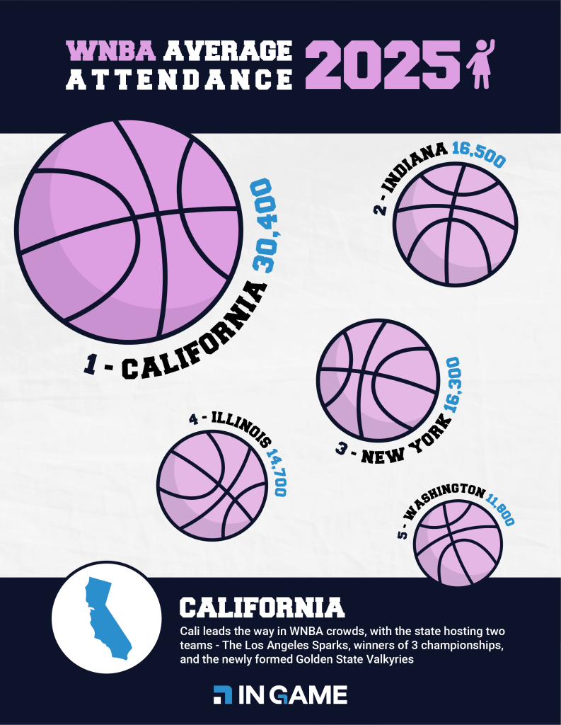 California’s dominance extends to basketball as well. California tops the WNBA attendance rankings, with an average of 30,400 fans attending game weeks across the Golden State Valkyries and Los Angeles Sparks. Indiana ranks second in WNBA attendance, drawing an outstanding average of 16,500 spectators to Indiana Fever games, reinforcing the state’s long-standing reputation as one of the country’s most passionate basketball markets.